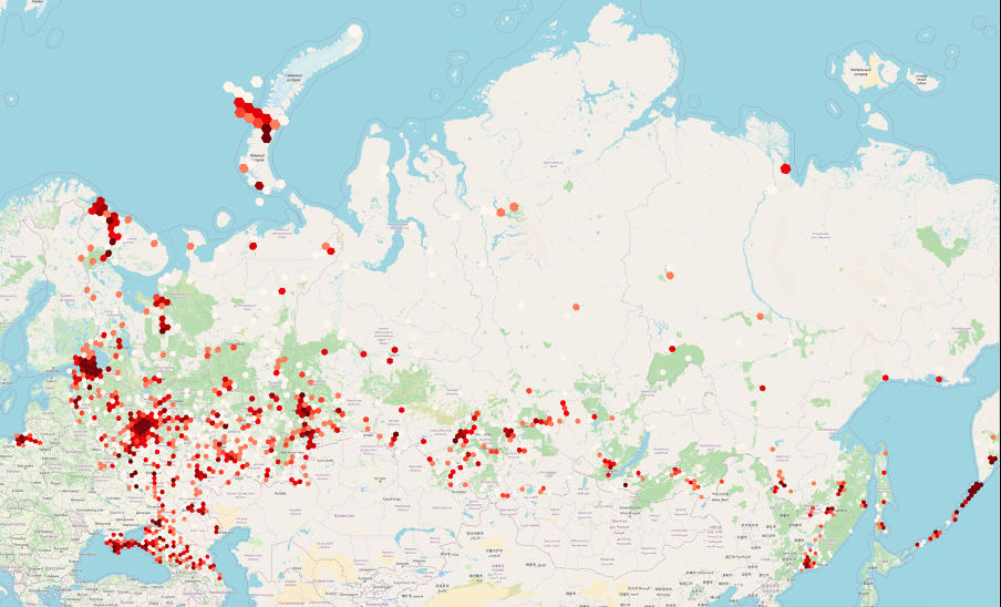 Within our datasets, we can analyze military objects and, through aggregation with H3, calculate the density of these objects in russia. The visualization of this analysis looks like this: