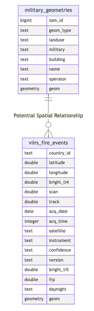 As for now, we have two tables: military_geometries and viirs_fire_events. Let's try to find those military facilities that have had fires (since the beginning of 2022) or those that have not yet 🙂.