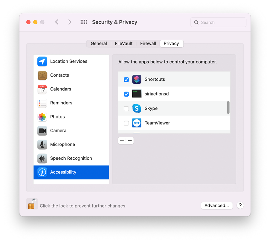 - In order for this command to work, you also need to allow both the Shortcuts app and siriactionsd in System Preferences > Security & Privacy > Privacy > Accessibility.