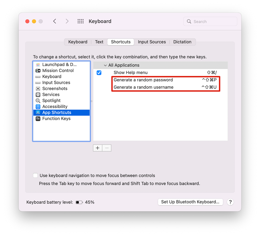 - In the "Keyboard Shortcut" field, enter the combination you want to use to trigger the shortcut, such as Control + Shift + Command + P for the password and Control + Shift + Command + U for the username.
